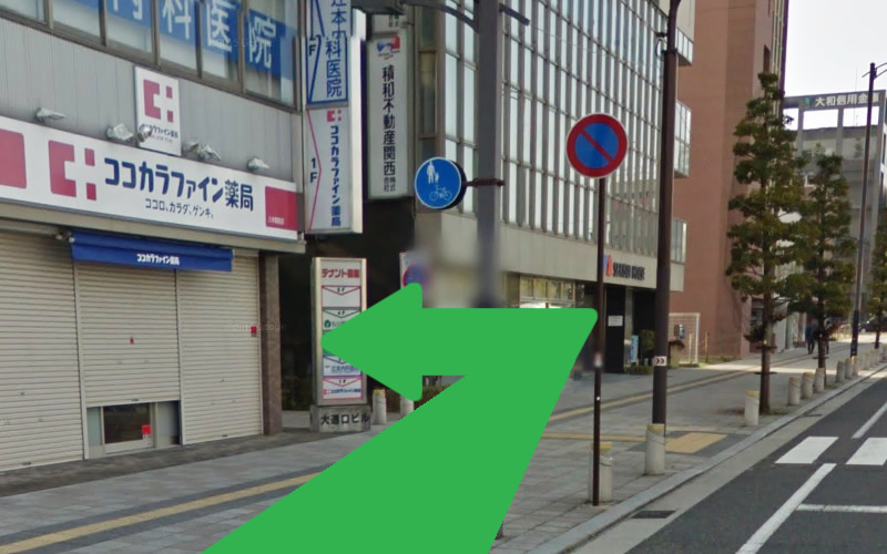 ココカラファイン薬局さんがある大通口ビルとフォレストヒルズ八木駅前ビルの間の細い道を真っすぐ進むと10分程度で病院に到着します。