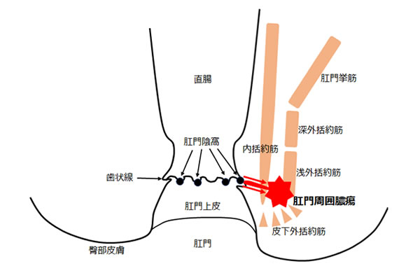 肛門陰窩(いんか)というくぼんだ部分に腸内の細菌が侵入し、肛門腺が化膿すると、肛門の周囲に膿が貯まる「肛門周囲膿瘍」ができます。