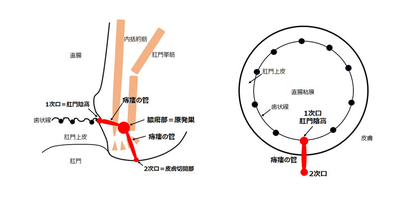 細菌が侵入する肛門陰窩を「1次口」あるいは「原発口」、膿がたまる部分を「原発巣」、膿が出ていく外側の皮膚部分を「2次口」と呼びます。