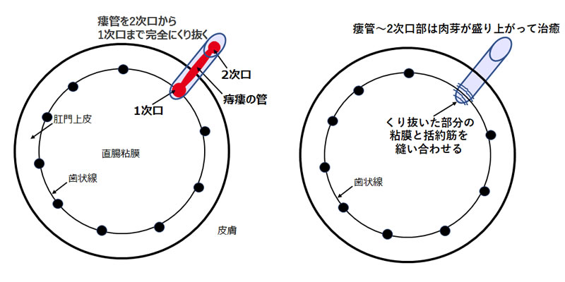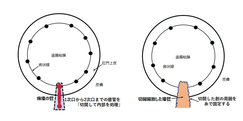 1次口から2次口までの瘻管を、「切開して開けて内部を処理する」方法です。