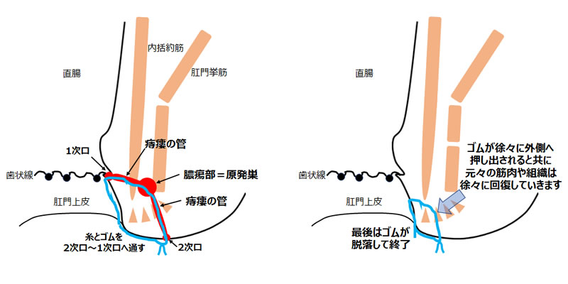 2次口から1次口までの瘻管に糸・ゴムを通して、ゆっくり締めていき、瘻管を切開していく方法です。